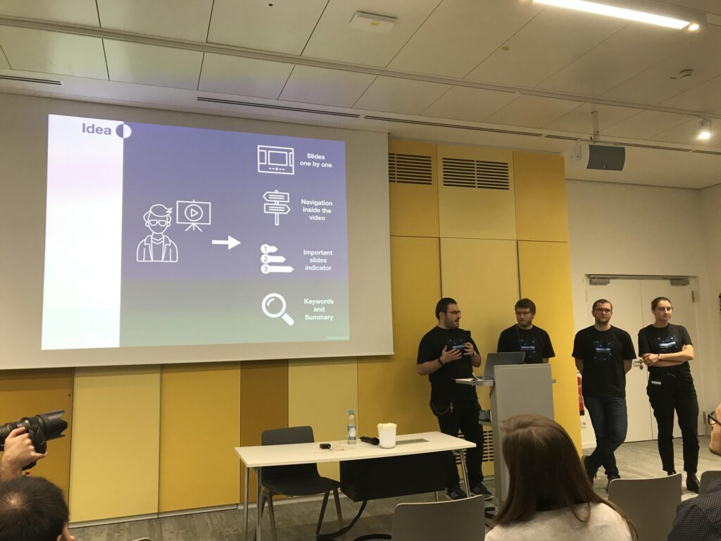 Beim Hackathon “Enhance Your Student Life” in München überzeugte unser Team die Jury mit einem hervorragenden Use Case, einer genialen Umsetzung und einer tollen Präsentation und wurde verdient als Sieger der Challenge gekürt. Sebastian Aigner, Daniel Below, Aleksei Semin und Natalia Shohina entwickelten gemeinsam mit dem ITVT Team an nur einem Wochenende die App “Conspectus.ai”. Diese fasst Videoaufzeichnungen von Uni-Vorlesungen effizient zusammen, so dass sich Studenten schnell und einfach auf die relevanten Inhalte fokussieren können. Verwendet wurden dafür u.a. Microsoft Video Indexing und Azure Cognitive Services.